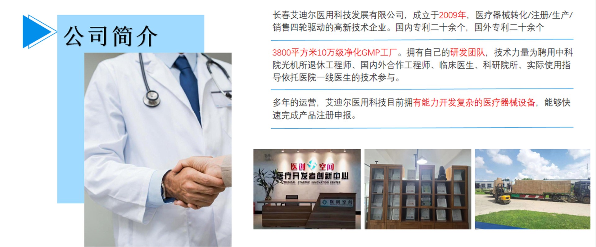 長春艾迪爾醫(yī)用科技發(fā)展有限公司為集產(自有工廠); 學(多所院校科研課題合作單位);研(研發(fā)成果轉化注冊)三位一體的高新技術企業(yè)。艾迪爾科技主要經營范圍為一次性醫(yī)療器械耗材的開發(fā),專注于抗菌肽新材料的開發(fā)和研制,以“IN-58抗菌肽一類新藥及原料藥注冊、激光類治療儀”兩個核心優(yōu)勢技術為中心。公司擁有標準GMP車間及健全的質量管理體系,擁有多個已上市和即將上市的產品,包括睡眠、泌尿、口腔、肝膽、消殺、婦科六大系列產品線。公司擁有核心專業(yè)技術報批團隊,承接國內外醫(yī)療器械專項成果轉化,具備自主研發(fā)能力及MAH服務能力。